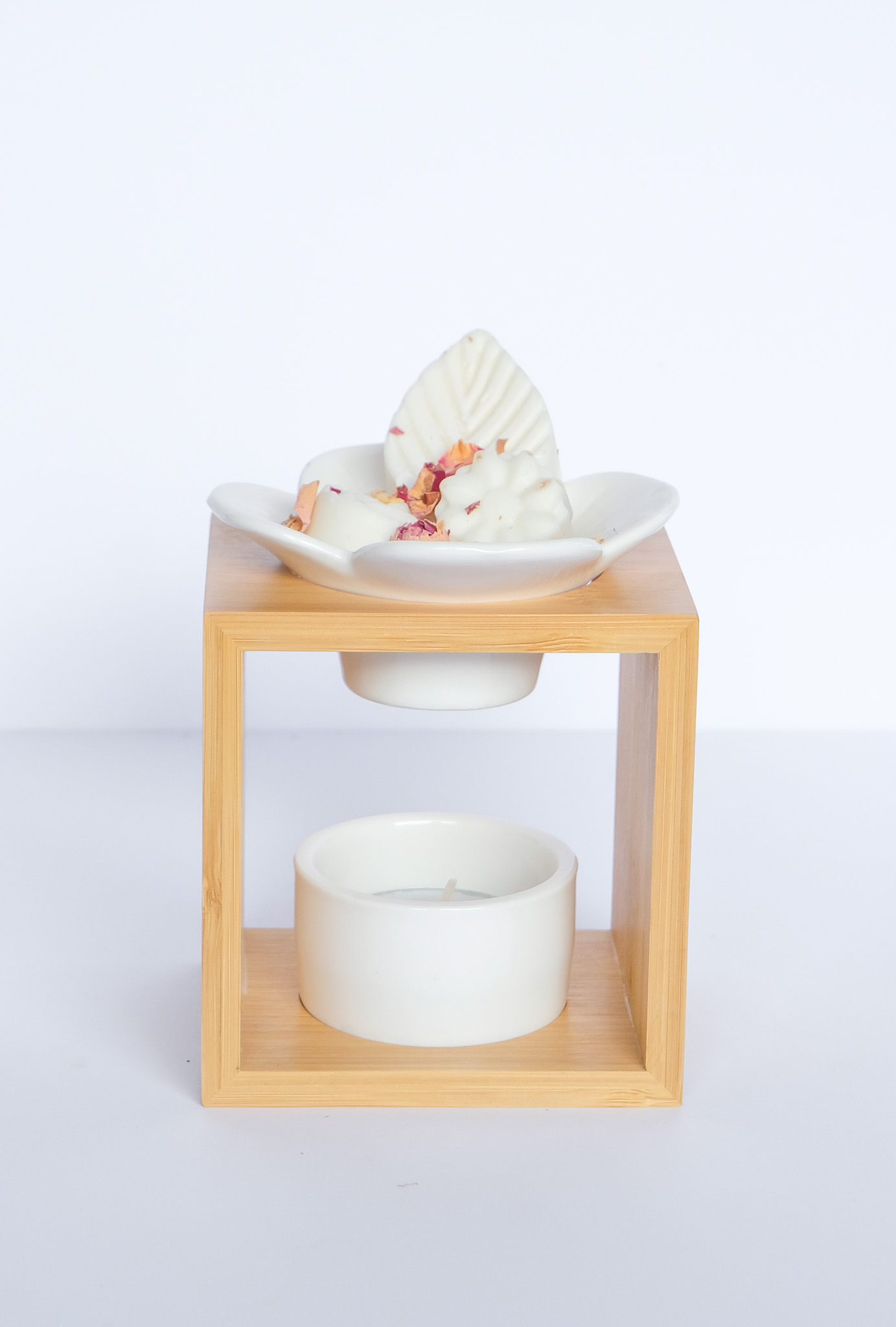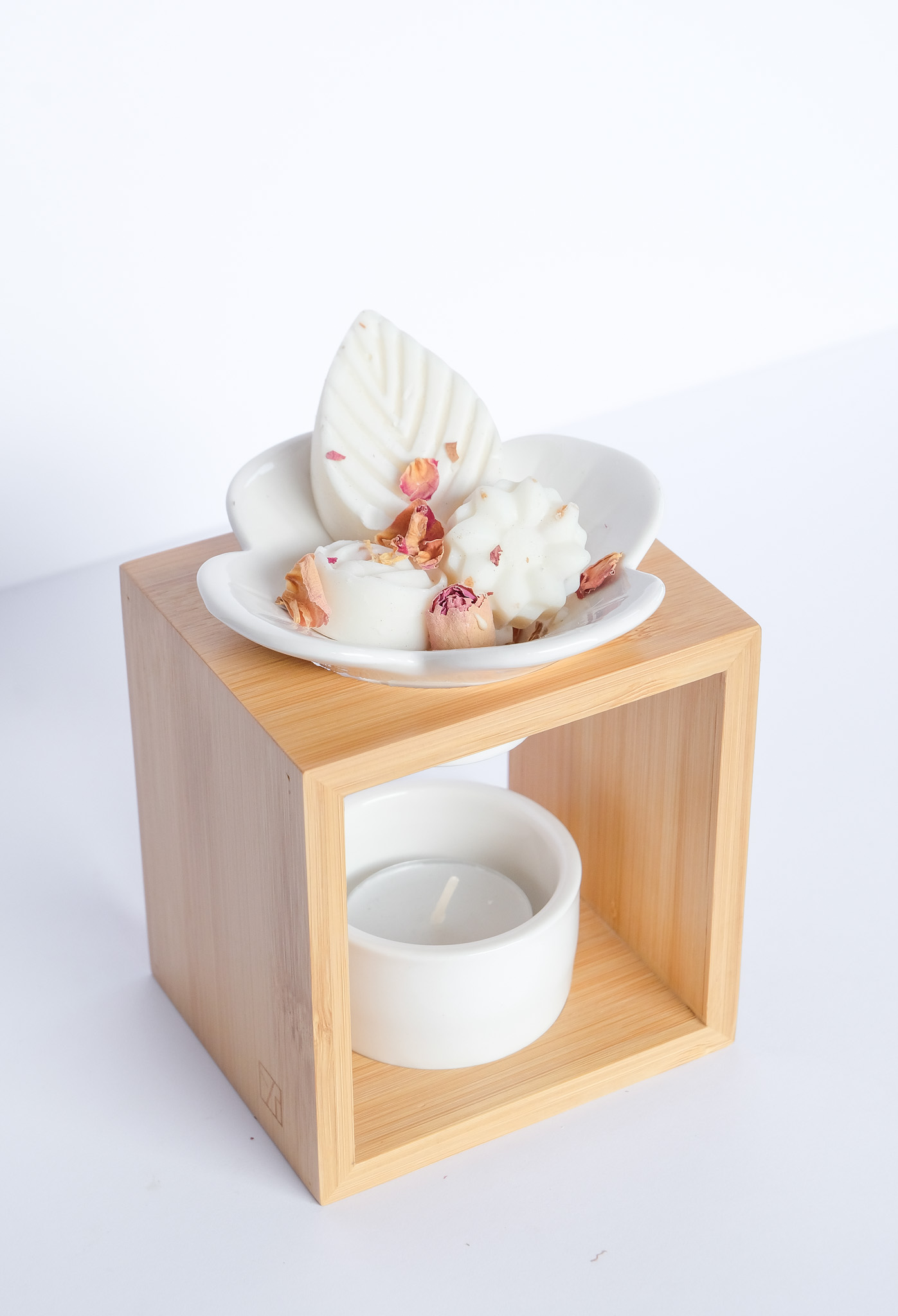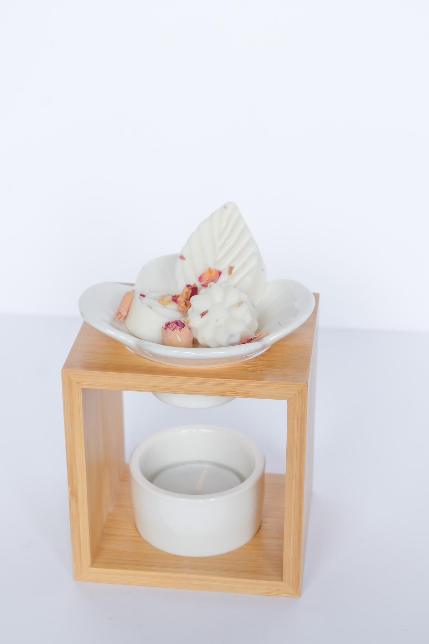 Fondants parfumés en forme de feuilles et petites fleurs coulés à la main dans mon atelier à Morzine. Parsemés de fleurs séchées françaises, ils révèlent le parfum envoûtant Miel d’Épicéa : des notes résineuses et sucrées qui créent une ambiance chaleureuse et réconfortante.