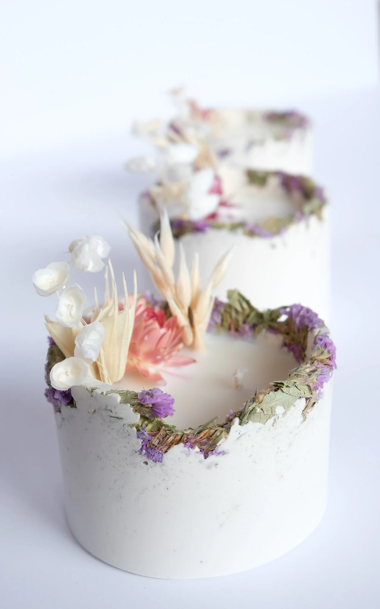 Je crée des bougies fleuries artisanales à Morzine, en Haute-Savoie, avec de la cire végétale de colza, des fleurs séchées françaises et des parfums de Grasse.
